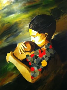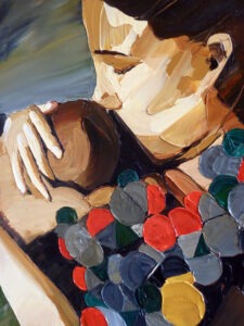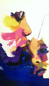 This series is a reflexion on female hormones throughout life, during pregnancy, breastfeeding, normal adult life with menstrual cycle, contraception, and menopause and how they influence/drive us. Some actual hormones (oxytocin, progesterone, serotonin) are incorporated in the oil paint.